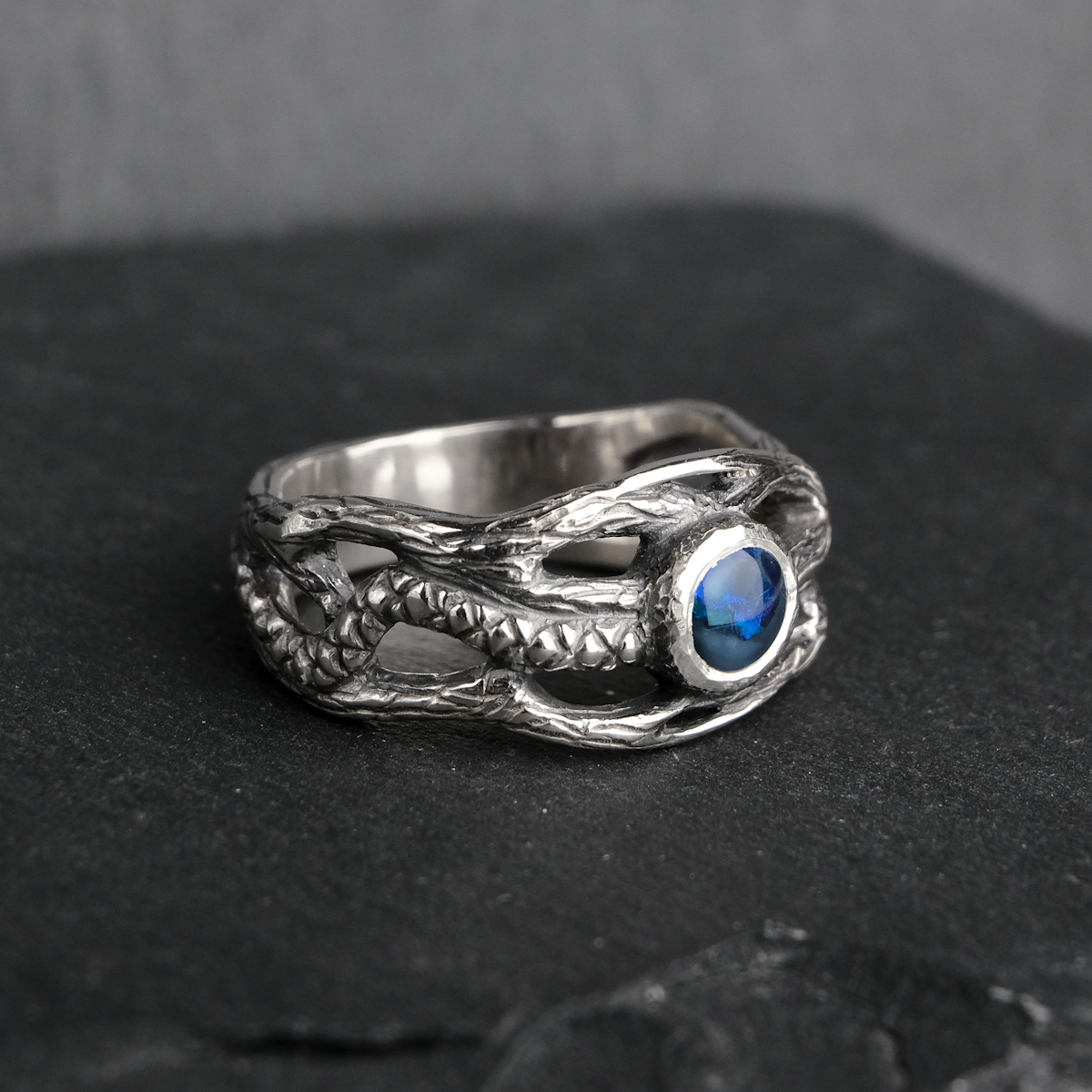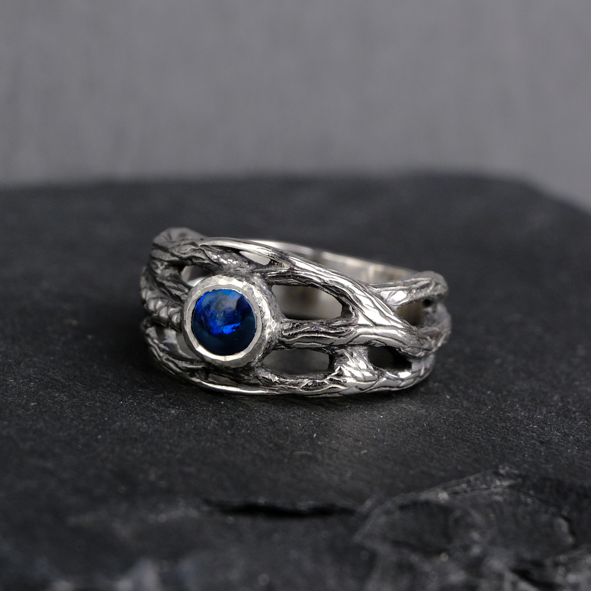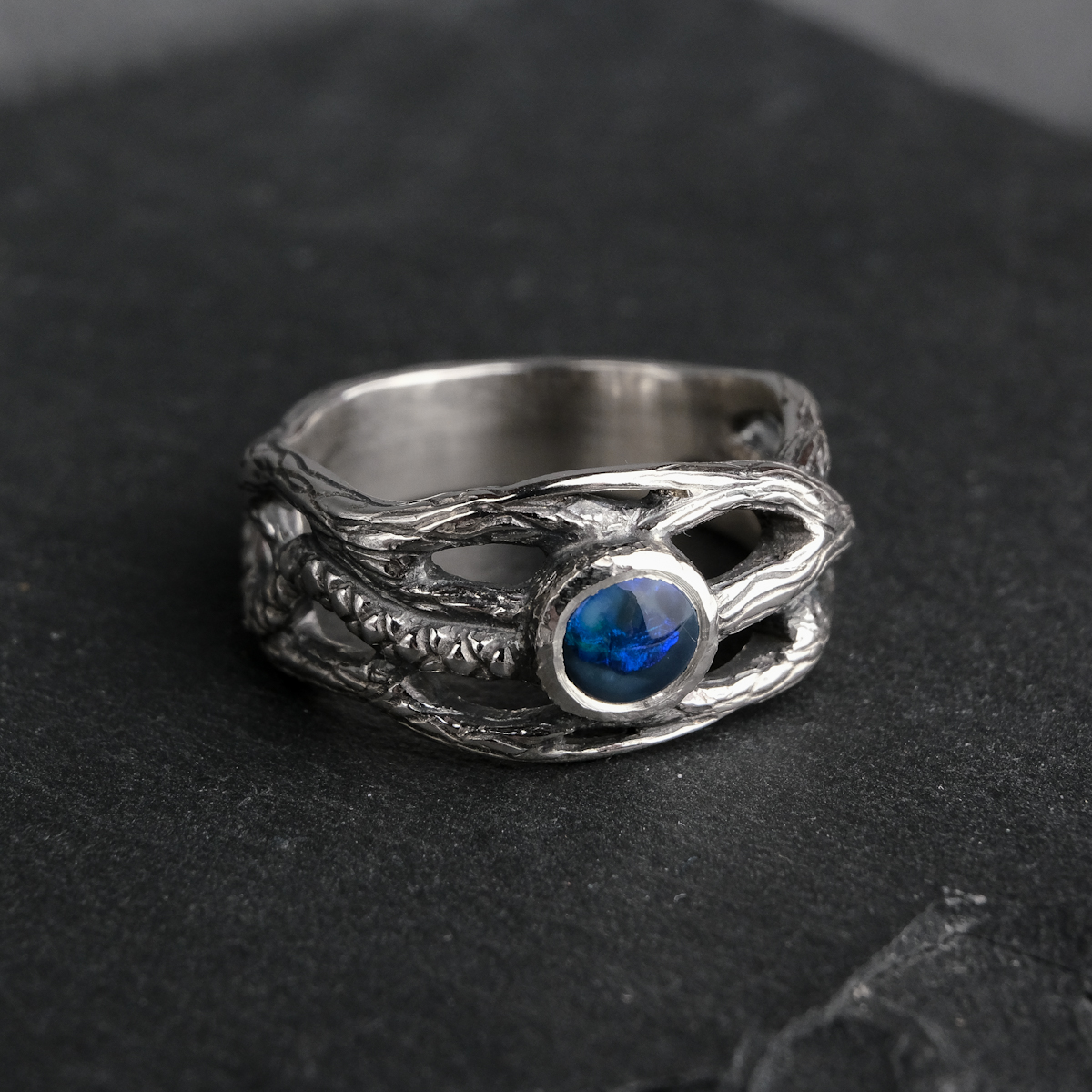 A customized version of my twig ring design set with a dark Australian opal. The opal has blue flashes across the greater part of its surface, and a smaller part has a paler colouring (see the video for the best view).