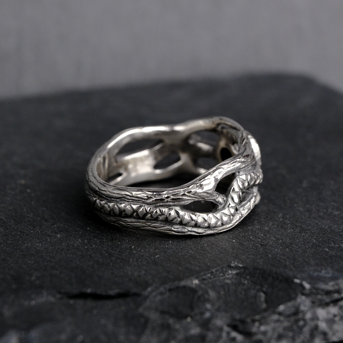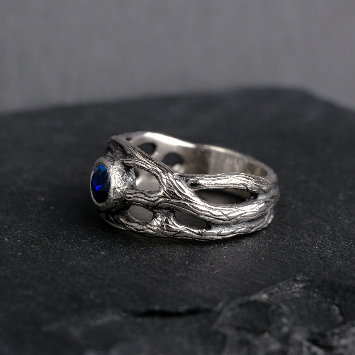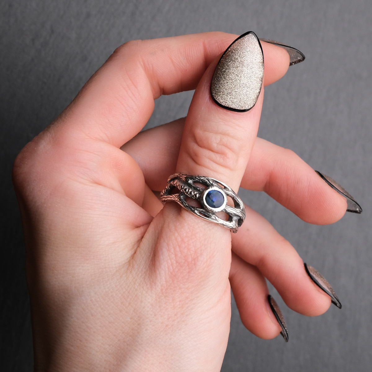 A customized version of my twig ring design set with a dark Australian opal. The opal has blue flashes across the greater part of its surface, and a smaller part has a paler colouring (see the video for the best view).